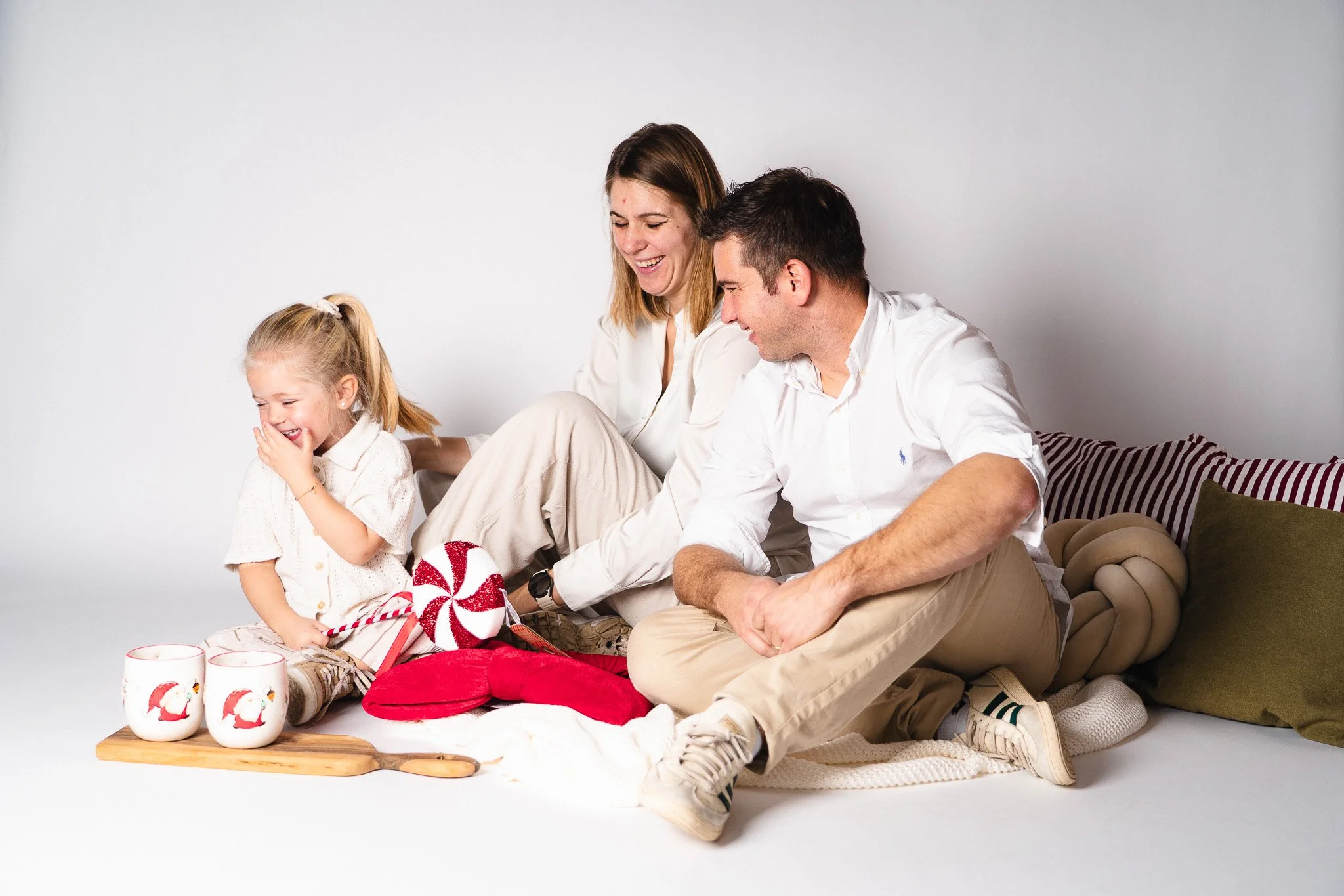 Ik werk met één witte achtergrond. Tijdens de shoot kiezen we samen welke spulletjes of decoratie we erbij zetten (of net weglaten). Zo wordt het helemaal jouw stijl, binnen de tinten: rood, groen en wit.